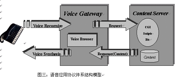 語音應用協(xié)議(VAP VA)定義了終端--?網(wǎng)關(guān)--?服務器的體系結(jié)構(gòu)。語音服務器(Voice Server )是語音應用的服務器,其包含語音應用和數(shù)據(jù)、內(nèi)容;與WAP體系結(jié)構(gòu)不同的是,語音網(wǎng)關(guān)(Voice Gateway) 做為終端和語音應用服務器的橋梁,作為語音應用協(xié)議中的重要部分:語音瀏覽器(Voice Browser)建于語音網(wǎng)關(guān)(Voice Gateway)內(nèi),而不象WAP協(xié)議中,micro browser 建于終端中。這是因為語音終端過于簡單以及語音數(shù)據(jù)可以通過電信網(wǎng)絡輕松與語音網(wǎng)關(guān)(Voice Gateway)交互。