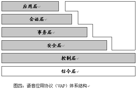 語音應用協(xié)議(VAP VA)也有一個類似于TCP/IP和WAP的層次結(jié)構(gòu),如下圖(圖四)所示: