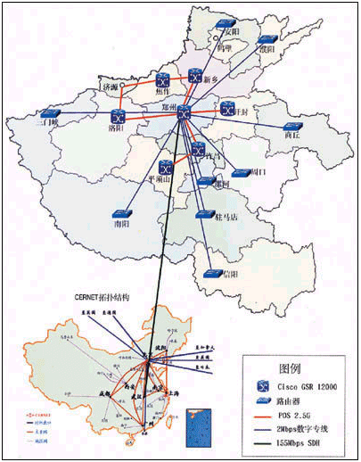 河南省教育科研計算機網(wǎng)(HERNET)作為中國教育科研計算機網(wǎng)絡(CERNET)在河南的省級網(wǎng)絡,提供河南省的教育與科研機構的Internet接入。在CERNET業(yè)已發(fā)展成為中國第二大互聯(lián)網(wǎng)的今天,各省教研網(wǎng)的建設變得尤為重要,河南省在2001年啟動“教育信息化年”規(guī)劃后,多方合作,采用思科系統(tǒng)(中國)網(wǎng)絡技術有限公司的高端網(wǎng)絡設備,將原來骨干帶寬僅為2M的教育科研網(wǎng)升級到2.5G,順利實現(xiàn)了教育科研網(wǎng)絡應用的飛躍性進步,并且真正實現(xiàn)了“三網(wǎng)合一”。