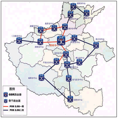 HERNET一期工程主干網(wǎng)采用IP POS技術,應用AVVID網(wǎng)絡體系結構,采用骨干傳輸網(wǎng)、城域網(wǎng)、接入網(wǎng)三層設計方案,以省網(wǎng)絡中心(設在鄭州大學網(wǎng)絡中心)、地市網(wǎng)絡中心、校園網(wǎng)三級管理模式。由省網(wǎng)絡中心向下以2.5G速度連接到各地市網(wǎng)絡中心,而向上則以155M速度連接到CERNET及Internet。整個一期工程實現(xiàn)了包括鄭州、許昌、平頂山、開封、洛陽、濟源、焦作以及新鄉(xiāng)等7個地市的2.5G連接,并形成了一個環(huán)網(wǎng)狀冗余拓撲結構,確保當網(wǎng)絡的一個節(jié)點出現(xiàn)問題時,數(shù)據(jù)可以通過其他途徑傳輸?shù)侥康牡,在一期工程完成后,?0多所大學、中小學等教育與科研單位以千兆速度連接到HERNET上,共有近50萬的用戶能夠充分利用高速帶寬獲得教育網(wǎng)資源。