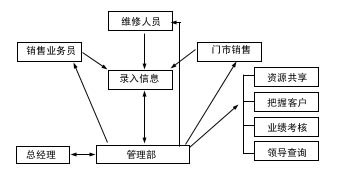 根據(jù)英普的業(yè)務(wù)管理模式,公司將門(mén)市銷(xiāo)售、維修部、大客戶部的業(yè)務(wù)管理工作,交由管理部全部管理和協(xié)調(diào),這三個(gè)部門(mén)將各自與客戶接待、交往過(guò)程、工作計(jì)劃全部明細(xì)記錄,交由管理部確認(rèn),管理部在保證必要保密的情況下,進(jìn)行工作再分配,同時(shí)加強(qiáng)業(yè)務(wù)考核和其他管理職能工作。其業(yè)務(wù)流程如圖1。