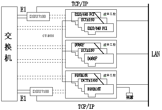 5.此平臺卡間采用CT-BUS協(xié)議(H.100 標準)連接,機間配合東進過機卡DCTx 160互連,兩臺七號信令網關DSIU7100 構成雙機雙鏈路結構。