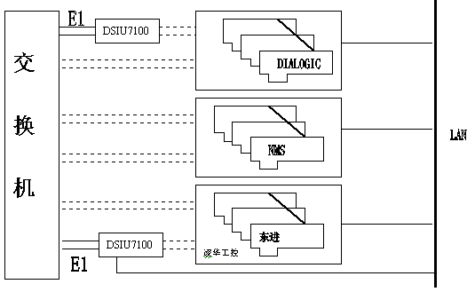 電信企業(yè)已有的112、114、170、189、180等系統(tǒng),這些系統(tǒng)的硬件設備各成體系,很可能由不同廠家的板卡組成:DIALOGIC、東進、NMS,或其他品牌;還可能采用不同的信令方式:NO.1 信令、NO.7信令、 ISDN信令。如何把五花八門的系統(tǒng)集成起來,以有效利用、降低成本?東進七號網關DSIU7100提供解決此問題的最好解決方案,系統(tǒng)可兼容不同廠家生產的不同數字中繼接口的語音板卡,最大限度的利用原有資源,結構如下圖所示: