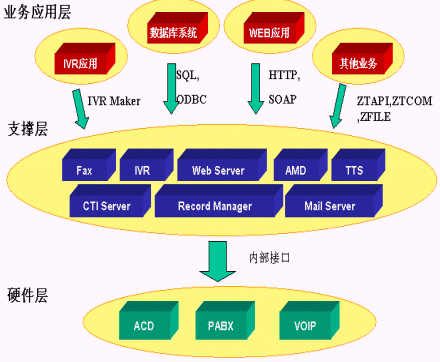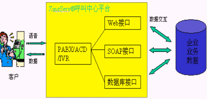 SQL Server,MySQL等多種數(shù)據(jù)庫(kù);通過(guò)HTTP調(diào)用第三方WEB程序,通過(guò)SOAP協(xié)議調(diào)用Web Server上的服務(wù),從而利用外部應(yīng)用進(jìn)一步加強(qiáng)IVR的功能;用戶只需做一些簡(jiǎn)單配置就可以實(shí)現(xiàn)電話訪問(wèn)數(shù)據(jù)庫(kù)、WEB和業(yè)務(wù)系統(tǒng)。如圖所示: