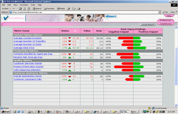 IntelliMiner 使用專(zhuān)利的數(shù)據(jù)挖掘技術(shù),自動(dòng)分析導(dǎo)致呼叫中心關(guān)鍵行為指標(biāo)(KPI)和呼叫中心設(shè)定目標(biāo)的因素及其關(guān)系和影響。所分析的數(shù)據(jù)揭示了導(dǎo)致呼叫中心KPI表現(xiàn)的潛在原因,例如過(guò)長(zhǎng)的通話時(shí)間,過(guò)多的轉(zhuǎn)接次數(shù),過(guò)長(zhǎng)的保持時(shí)間,導(dǎo)致了降低生產(chǎn)力和降低客戶滿意度。IntelliMiner是質(zhì)量管理子系統(tǒng)的一個(gè)選項(xiàng)。
