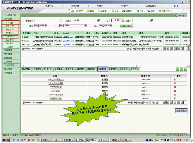 和傳統(tǒng)日程相比,傳統(tǒng)日程是不和客戶掛鉤的,事后查閱很不方便,就好比在一個筆記本上去查詢以前的筆記,要找出與某個客戶的日程安排,根本不可能,而且,很多人的備忘錄寫了之后,也不會再去翻閱了。有了客戶相關聯(lián)的日程后,以后通過客戶為入口,可以很清楚的查閱XX時候,XX人和該客戶交往的日程安排及記錄。