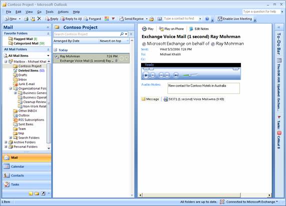 Outlook 2007,它將語音郵件作為優(yōu)先數(shù)據(jù)類型來集成。Outlook 2007 界面允許用戶連同其它數(shù)據(jù)項一起對語音郵件消息進行排序、搜索和確定其優(yōu)先級;此外,用戶可以在他們的座機上播放語音郵件消息,并向語音郵件消息添加附注,以便連同關(guān)聯(lián)的發(fā)件人和日期信息一起對消息內(nèi)容建立索引。(請參見圖2)Outlook 還提供了對用戶可配置的統(tǒng)一消息選項的完全支持,包括配置問候語和重設(shè) PIN。