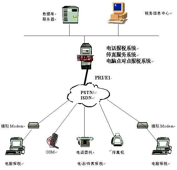 以上三種電子報稅方式,除網(wǎng)上報稅,稅務機關需通過建立專門的網(wǎng)站,配置專線接上因特網(wǎng)外,其他兩種報稅方式(即電話報稅和電腦點對點報稅),都需要用戶通過電話線撥入到稅務機關,從通訊上說,這兩種方式涉及三種通訊模式,即:語音,傳真及數(shù)據(jù)通訊,為了實現(xiàn)通訊資源的共享,節(jié)省線路及設備投資,稅務機關非常希望將這三種通訊模式(語音,傳真,數(shù)據(jù))建立在一個統(tǒng)一的接入平臺中。而市場上一般的產(chǎn)品都無法做到將這三種通訊方式統(tǒng)一在一個平臺中,用戶需購買語音卡,傳真卡來滿足電話報稅的需求,購買Modem Pool和多串口卡來滿足電腦點對點報稅的需求,從而造成設備投資上的很大浪費,通訊線路資源也不能得到共享。