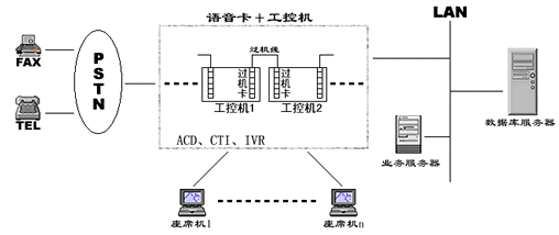 在一些小型CALL CENTER系統(tǒng)中,人們通常通過語音板卡加工控機(jī)的方式搭建系統(tǒng),通常一臺設(shè)備就集成了ACD、IVR、CTI等各種資源,各資源的使用、調(diào)派通過軟件進(jìn)行控制,有效的解決了建設(shè)成本高、系統(tǒng)構(gòu)造繁復(fù)的問題,具有相當(dāng)?shù)撵`活性。然而由于工控機(jī)和語音板卡容量有限,同時其標(biāo)準(zhǔn)最多只能是工業(yè)級標(biāo)準(zhǔn),因此在構(gòu)建相對大型的呼叫中心時就總是捉襟見肘。為了增加系統(tǒng)容量,解決多臺PC之間進(jìn)行通道交換的難題,人們又設(shè)計(jì)了過機(jī)卡和過機(jī)線來解決,其應(yīng)用系統(tǒng)如下圖: