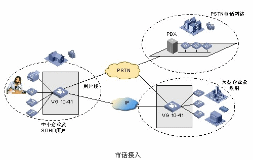 - 同時(shí),VG 語音網(wǎng)關(guān)還提供FXO接口直接連接本地市話PSTN網(wǎng)絡(luò),從而實(shí)現(xiàn)SOHO用戶直接與市話連通,這種市話接入方式可以作為IP電話應(yīng)用的靈活備份,一方面節(jié)省了用戶投資,另一方面提供了意外情況(如停電)的處理方案。