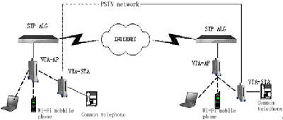 VTA-AP設(shè)備接入Internet,并為Wi-Fi手機(jī)與VTA-STA設(shè)備提供無(wú)線接入服務(wù),實(shí)現(xiàn)無(wú)線語(yǔ)音數(shù)據(jù)傳輸,同時(shí),其基于行業(yè)標(biāo)準(zhǔn)的64/128位WEP(有線等效加密)加密協(xié)議以及內(nèi)嵌的802.1X認(rèn)證功能,為無(wú)線傳輸提供了安全保證。VTA-STA作為客戶端VoIP網(wǎng)關(guān)置于各個(gè)企業(yè)分支機(jī)構(gòu)或家庭用戶桌面,其RJ11口可以連接普通話機(jī)撥打IP電話,語(yǔ)音數(shù)據(jù)通過(guò)VTA-AP設(shè)備到達(dá)對(duì)端實(shí)現(xiàn)全雙工語(yǔ)音通話。同時(shí)設(shè)備提供線路備份功能,當(dāng)無(wú)線信號(hào)受到干擾VTA-STA與VTA-AP無(wú)法建立連接或Internet出現(xiàn)故障時(shí),可以自動(dòng)切換到PSTN網(wǎng)絡(luò)通過(guò)普通公共電話網(wǎng)撥打?qū)Χ恕?