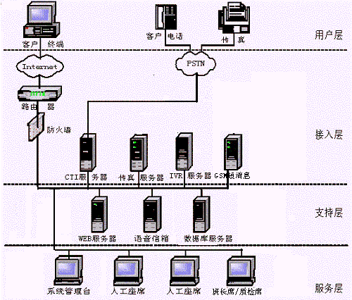 。。整個系統的物理構成包括: CTI服務器、IVR/FAX服務器、人工座席、管理工作站(計費、統計、系統管理、網絡管理)、數據庫服務器、WWW服務器、網絡系統等,其網絡結構圖如下: