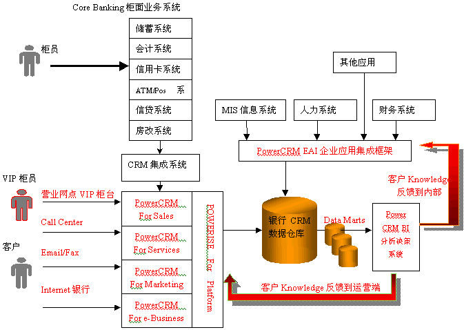 利用PowerCRM的銀行分析型CRM解決方案,對(duì)客戶(hù)信息進(jìn)行全面的分析,從而挖掘出許多客戶(hù)知識(shí),繼而制定和改進(jìn)相應(yīng)的市場(chǎng)策略,應(yīng)用于PowerCRM運(yùn)營(yíng)型CRM系統(tǒng)中,更好地指導(dǎo)營(yíng)銷(xiāo)人員為客戶(hù)服務(wù)和完善客戶(hù)服務(wù)流程;同時(shí)也需要反饋到銀行內(nèi)部系統(tǒng),用于增強(qiáng)銀行內(nèi)部的運(yùn)營(yíng)效率。