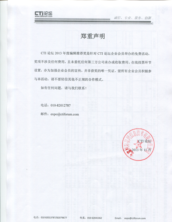 2.將相應(yīng)電子文檔以電子郵件附件形式發(fā)送到:expo@ctiforum.com,郵件主題為:CTI論壇2013年度“編輯推薦獎(jiǎng)”