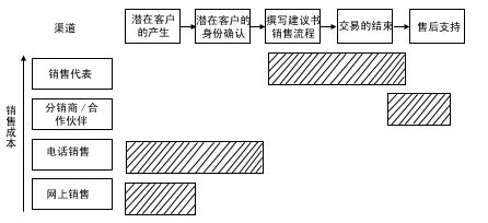 渠道整合強(qiáng)調(diào)在一個(gè)銷售過程中分工的不同給企業(yè)帶來更多的利潤(rùn),將銷售過程的任務(wù)一一分配給不同成本的渠道來完成。銷售過程的中間環(huán)節(jié)——面對(duì)面的銷售和交易的達(dá)成,通常需要由成本較高的區(qū)域銷售代表和分銷伙伴來完成,客戶的產(chǎn)生及身份的確認(rèn)和售后服務(wù)環(huán)節(jié)通常由低成本渠道完成,F(xiàn)在,我們對(duì)照?qǐng)D4來比較一下: