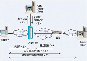 在網(wǎng)通有限公司為中建總公司建設(shè)的網(wǎng)絡(luò)中,當(dāng)用戶撥上網(wǎng)絡(luò)時(shí),網(wǎng)通有限公司的認(rèn)證系統(tǒng)會根據(jù)帶域名的用戶名確定是哪個地區(qū)的VPDN用戶,并通過一系列步驟實(shí)現(xiàn)用戶與企業(yè)之間的內(nèi)部通信。