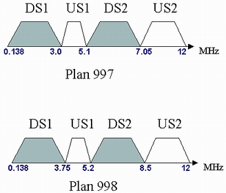 此標(biāo)準(zhǔn)從中國的實際情況出發(fā),既適應(yīng)接入網(wǎng)絡(luò)總體流量的非對稱特性,又考慮滿足一些對上行速率要求較高、接近對稱的業(yè)務(wù)需求;既考慮當(dāng)前技術(shù)和設(shè)備狀況,又兼顧未來技術(shù)發(fā)展和一段時期內(nèi)可能的業(yè)務(wù)需求,提出了中國的VDSL頻段劃分方式。這種方式在Plan998