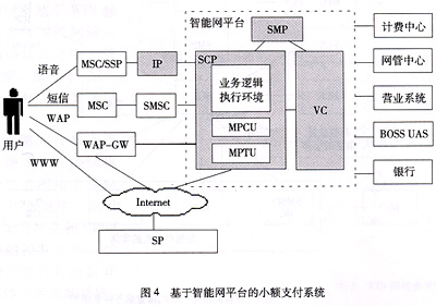 鑒于以上原因,目前中國移動正在建設(shè)的全國范圍的小額支付系統(tǒng)已確定采用基于智能網(wǎng)平臺的建設(shè)方式。基于智能網(wǎng)平臺的小額支付系統(tǒng)如圖4所示。