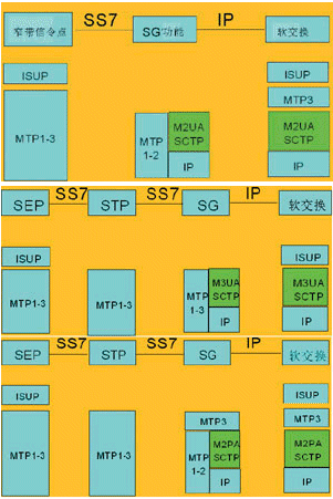 ·信令網(wǎng)關(guān)(SG)終結(jié)MTP2協(xié)議,將MTP2、MTP3之間的原語封裝為M2UA消息,在信令網(wǎng)關(guān)功能和軟交換設(shè)備間傳遞,信令網(wǎng)關(guān)與軟交換分別實(shí)現(xiàn)MTP1/2和3層功能;