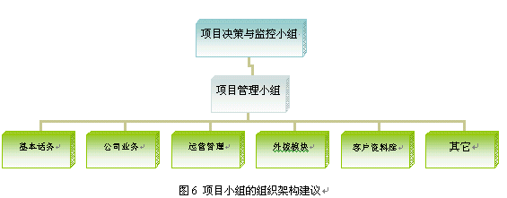 。。4.2 成立共同的項(xiàng)目小組,盡可能分模塊負(fù)責(zé)。需求方一個(gè)項(xiàng)目小組,開(kāi)發(fā)方一個(gè)項(xiàng)目小組,雙方派出項(xiàng)目經(jīng)理的方式往往不能滿足Call Center這樣復(fù)雜的系統(tǒng)需要。建議雙方建立共同的項(xiàng)目小組,充分溝通與合作,控制項(xiàng)目的范圍和質(zhì)量。圖6 是項(xiàng)目小組的建議。