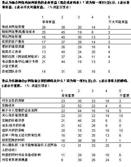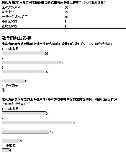 我們調(diào)查的企業(yè)中,有超過三分之二將在未來五年內(nèi)實(shí)現(xiàn)大多數(shù)或者所有部門向融合網(wǎng)絡(luò)的轉(zhuǎn)型。大部分企業(yè)采取按部就班的形式在某些特殊部門和業(yè)務(wù)開始部署。在融合應(yīng)用中,IP語音電話將在未來三年內(nèi)吸引大量投資;管理人士期望通過大幅削減公司內(nèi)部的通話費(fèi)用獲得早期的回報(bào)。在更廣泛的層面上,大多數(shù)管理者預(yù)計(jì),融合網(wǎng)絡(luò)對其企業(yè)的商業(yè)影響將會(huì)“非常重要”或者“重要”。