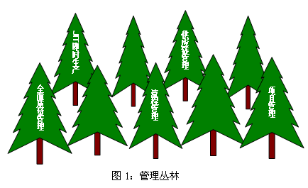 用“叢林”一詞來(lái)形容目前管理方法的林立,并沒(méi)有夸張的成份。在這片叢林中,許許多多根深葉茂的“參天大樹(shù)”不斷產(chǎn)生。許多專(zhuān)家學(xué)者把注意力集中于管理的某一方面,如質(zhì)量管理、流程再造、項(xiàng)目管理、供應(yīng)鏈管理等都體現(xiàn)了不同的管理視角。不同管理方法在理論緣由上相互促進(jìn)、相互影響,他們以各自不同的方式和視角描繪了管理的不同側(cè)面。