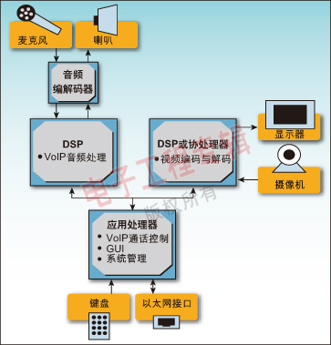 看看第一代可視電話所采用的架構(gòu),我們可以發(fā)現(xiàn)采用了不同的處理器分別用于語(yǔ)音、視頻和系統(tǒng)控制功能。因?yàn)樘幚硇枰话悴捎冕槍?duì)密集媒體處理運(yùn)算(數(shù)字信號(hào)處理或DSP)優(yōu)化的處理器。例如:一個(gè)DSP用來(lái)處理語(yǔ)音處理功能,包括語(yǔ)音編碼/解碼、音調(diào)發(fā)生和檢測(cè)、回聲消除以及噪聲消減;一個(gè)DSP或?qū)S脜f(xié)處理器來(lái)處理視頻編碼和解碼;一個(gè)應(yīng)用處理器管理VoIP通話控制協(xié)議以及用戶界面(見(jiàn)圖1)。這種方式需要多個(gè)編程模型和開(kāi)發(fā)工具鏈,這反過(guò)來(lái)會(huì)導(dǎo)致需要更大的開(kāi)發(fā)團(tuán)隊(duì),增加培訓(xùn)和額外的成本。