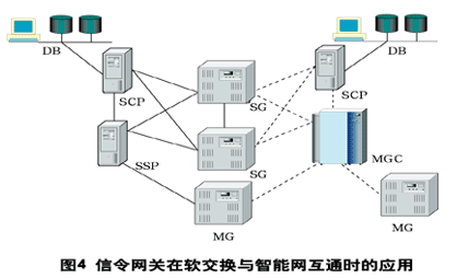 對現(xiàn)有的智能網(wǎng)來說,軟交換以及它所控制的節(jié)點(diǎn)構(gòu)成一個(gè)虛擬的SSP,可在INAP/CAP/TCAP/SCCP接口上通過信令網(wǎng)關(guān)與現(xiàn)有智能網(wǎng)中的SCP互通,共同提供智能網(wǎng)業(yè)務(wù),或者直接和IP SCP進(jìn)行互通,實(shí)現(xiàn)和原有智能網(wǎng)業(yè)務(wù)的互通(圖4)。