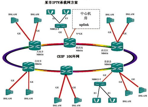 下面簡單介紹一下網(wǎng)通某地市基于CESP的IPTV承載網(wǎng)方案。傳統(tǒng)的IPTV承載都是通過2.5G MSTP或RPR千兆環(huán)來傳輸流媒體數(shù)據(jù)的,其問題在于:按照現(xiàn)有的IPTV用戶數(shù)和明年計劃發(fā)展用戶數(shù),平均每個村有近50個IPTV用戶,一般一個鄉(xiāng)要管轄30個村。按照每戶IPTV 2M的帶寬分配,一個鄉(xiāng)就需要3G的接入帶寬才能滿足業(yè)務發(fā)展的需求,而現(xiàn)有的千兆環(huán)和2.5G MSTP根本就無法滿足日益膨脹的數(shù)據(jù)業(yè)務需求。因此,亟須采用一種全新的數(shù)據(jù)承載平臺來改造現(xiàn)有的縣、鄉(xiāng)、村的數(shù)據(jù)接入網(wǎng)絡。