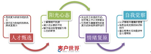 在上述的這三類員工中,我們更希望培養(yǎng)的是第一類,最不想見到的是第三類。但天生就具有很強(qiáng)情緒管理能力的員工,是可望不可求的。如果僅僅是依賴人員的天賦,管理也會陷入更多的“surprise”中,在幾百上千人的呼叫中心出現(xiàn)不可控的局面。我們需要的,也許是個系統(tǒng)化的工程,能夠直面呼叫中心員工需要“情緒勞動”的特點,從另外一個角度去理解和改善員工的表現(xiàn),梳理各項相關(guān)工作,按照如下的步驟形成員工支持體系: