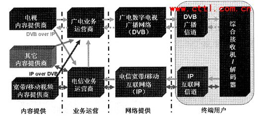 從圖2中我們可以看出,IPTV實(shí)際上有電信和廣電兩條業(yè)務(wù)通道。其中,電信的業(yè)務(wù)通道是雙向的通道,而廣電的業(yè)務(wù)通道是單向的,電視內(nèi)容提供商可以利用DVBoverIP技術(shù)通過(guò)電信業(yè)務(wù)運(yùn)營(yíng)商來(lái)開展IPTV業(yè)務(wù)。寬帶/移動(dòng)視頻內(nèi)容提供商也可以利用IPover