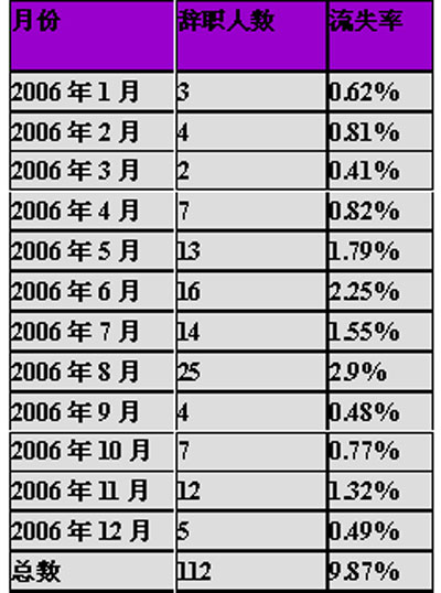 在進行收集、分析一些客服中心資料的過程中,與相關領導人員進行較深入的思想碰撞,尤其是與中國移動江蘇省客服中心副總經(jīng)理張立春的交流,尤為深刻。一組數(shù)據(jù)深深的震撼著我的思想,一是離職率2006年,僅為:9.87%,遠遠好于整個行業(yè)的平均水平;二是員工的心理健康和壓力狀況遠遠好于全國的平均水平;三是客戶服務質量保持行業(yè)領先地位,各項指標具體數(shù)值陳述如下。