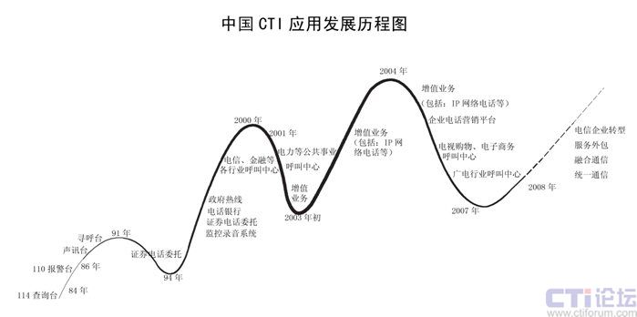 CTI在中國已經(jīng)發(fā)展了二十多年,已經(jīng)從最早的電信行業(yè)CTI應(yīng)用發(fā)展到金融(包括銀行、保險、證劵及基金)、電力、郵政、企業(yè)(包括煙草、汽車、家電、IT、互聯(lián)網(wǎng)、旅游、報業(yè)、航空、物流、醫(yī)療、公共事業(yè)等)、政府、軍隊等各行各業(yè)的應(yīng)用。特別在1995年到2001時期,是CTI應(yīng)用發(fā)展最快,普及面最廣的時期,也是CTI市場進入了第二次高潮;從2002開始增值業(yè)務(wù)是整個CTI行業(yè)的突破口,整個行業(yè)以增值業(yè)務(wù)為主,CTI市場進入了第三次高潮;從2006年開始,增值業(yè)務(wù)進入了衰退期,整個CTI行業(yè)市場出現(xiàn)了嚴(yán)重的危機,加上新的技術(shù)出現(xiàn),技術(shù)的換代,對原來的傳統(tǒng)語音產(chǎn)品和公司是個致命的打擊。