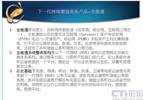 何謂CTI?有許多人都是非常片面的理解,在呼叫中心市場把CTI行業(yè)帶到最紅火的第二次高潮時許多人都以為CTI就是呼叫中心、呼叫中心就是CTI;2002年當(dāng)呼叫中心市場開始出現(xiàn)萎縮時,許多大公司紛紛把CTI裁剪,還有許多公司倒閉時,剩下的公司日子很難過時,許多人認(rèn)為CTI完了、紛紛轉(zhuǎn)行。我在2003年1月6日‘中國計算機報社舉辦了2003年CTI和呼叫中心研討會’時講過:呼叫中心市場很冷,但CTI市場不冷,CTI行業(yè)又要開復(fù)蘇,因為我通過一年多的增值業(yè)務(wù)的摸索,認(rèn)為增值業(yè)務(wù)將重新帶動CTI行業(yè)第三次高潮,關(guān)鍵在于增值業(yè)務(wù)的創(chuàng)新應(yīng)用。隨后的幾年里增值業(yè)務(wù)把CTI行業(yè)帶到一個新的高度,許多人又認(rèn)為CTI就是IVR,就是增值業(yè)務(wù);但到了07年增值業(yè)務(wù)市場嚴(yán)重萎縮,大家又以為CTI不行了、紛紛轉(zhuǎn)行和離開。