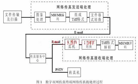 實現(xiàn)完整網(wǎng)絡傳真收發(fā)的功能與步驟,可以分為網(wǎng)絡傳真發(fā)送處理及網(wǎng)絡傳真接收處理兩個部分。其中網(wǎng)絡傳真接收端的處理可以理解為網(wǎng)絡傳真發(fā)送處理的逆過程。