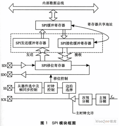 dsPIC30F6014提供了2個(gè)SPI接口模塊,每個(gè)接口模塊包括三個(gè)特殊功能寄存器和四個(gè)引腳。SPIxBUF是數(shù)據(jù)緩沖寄存器。需要注意的是,接收緩沖SPIxRBF和發(fā)送緩沖SPIxTBF共享同一個(gè)地址,即它們都是地址映射到SPIxBUF的。也就是說(shuō),當(dāng)對(duì)接收或發(fā)送緩沖寄存器操作時(shí),都只能對(duì)SPIxBUF進(jìn)行操作,而不能直接對(duì)SPIxRBF或SPIxTBF進(jìn)行操作。SPIxCON是控制寄存器,用來(lái)對(duì)sPI模塊的操作模式等進(jìn)行配置;SPIxSTAT是狀態(tài)寄存器,用來(lái)標(biāo)示SPI模塊所處的狀態(tài)。其模塊框圖如圖1所示。