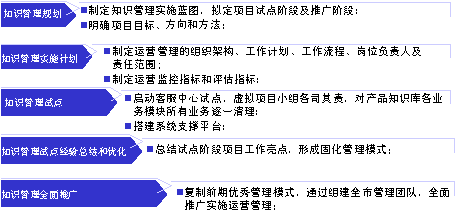 萬丈高樓平地起,本項目由客服中心總經(jīng)理牽頭,副總經(jīng)理和部門經(jīng)理組成領(lǐng)導小組,全面審視中心運營管理現(xiàn)狀,探索“SECI知識循環(huán)管理”理論與實際工作結(jié)合點,針對客服中心滿意度提升的三大主要癥結(jié)勾勒出知識管理實施藍圖,試點階段和推廣階段,總體目標和階段性目標,監(jiān)控手段和評估指標等。