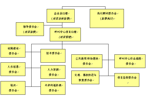 。。對于呼叫中心建設項目實施的規(guī)劃是一個需要付出巨大心血與努力的階段,這個階段需要企業(yè)或組織機構(gòu)所有人員的廣泛參與和專家意見。對于呼叫中心運營的規(guī)劃,相對與呼叫中心建設項目而言則顯得有些"特殊",它意味著整個呼叫中心建設項目團隊不可能有全部的時間花費在運營規(guī)劃議題上。因此,我們可以將全部項目規(guī)劃工作與任務拆分成若干個規(guī)劃細項,這將保證有較強的可操作性。我們建議采取的方式是將整個項目實施規(guī)劃團隊拆分成負責各個專項實施的小組委員會或附屬委員會。這些小組委員會將集中關注各自特定的項目實施上,當有需要時,與其他各小組進行交流與溝通,并在相關問題上達成一致。按照以上項目組織管理架構(gòu)其目的是,在項目實施的關鍵環(huán)節(jié)和領域,能產(chǎn)生出更具深度的規(guī)劃方案。這樣操作同時可以使更多的人員參與進來,并有利于增強各個小組的責任感,有助于項目的成功實施。以下的項目指導委員會組織架構(gòu)不是任何呼叫中心建設項目都能適用的,但是它在某種程度上已經(jīng)為呼叫中心項目規(guī)劃提出了一個基本方針,按照這個思路它將保證項目的成功實施。而對于規(guī)模較小的呼叫中心項目,以上的組織架構(gòu)成員將扮演多重角色,并負責多項任務項目的實施。就呼叫中心項目規(guī)劃與實施團隊而言,應由若干個負責不同領域?qū)嵤┑男〗M來組成,以便確保呼叫中心建設項目的所有領域,及各個階段的有效實施。呼叫中心項目規(guī)劃與實施組織架構(gòu)請見下圖。