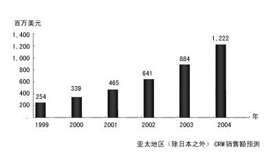 亞太地區(qū)正在成為CRM應用軟件的新興市場。1999年亞太地區(qū)CRM市場的年增長率達33.5%。其中中國CRM市場是除日本外最具發(fā)展?jié)摿Φ氖袌。預計到2004年,中國CRM市場的復合年平均增長率為60%。