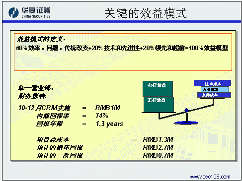 華夏證券經(jīng)紀(jì)業(yè)務(wù)總部的姚磊作為唯一的成功應(yīng)用案例代表,主要是和與會的金融機(jī)構(gòu)分享在客戶關(guān)系管理規(guī)劃方面的一些成功經(jīng)驗(yàn)。華夏證券認(rèn)為,對于證券公司的經(jīng)紀(jì)業(yè)務(wù)來講,客戶關(guān)系管理的主要目標(biāo)應(yīng)該是把客戶關(guān)系管理系統(tǒng)的核心功能融入開戶、交易、服務(wù)、咨詢等四個與客戶互動的過程之中,比如:客戶資料規(guī)戶整合形成統(tǒng)一的客戶號,管理客戶交易偏好和產(chǎn)品偏好上的變化,配合多種渠道建立一對一銷售流程,客戶終身價值管理。在風(fēng)險控制方面,華夏證券同樣貢獻(xiàn)了寶貴的經(jīng)驗(yàn),在這方面他們認(rèn)為最重要的方面是要做好高層領(lǐng)導(dǎo)的灌輸和培訓(xùn)工作,讓企業(yè)的高層領(lǐng)導(dǎo)對于客戶關(guān)系管理有一個正確的理解,從而對于項(xiàng)目的投資有一個合理的預(yù)期和實(shí)證,通俗一點(diǎn)說,就是首先為整個項(xiàng)目找一個合適的發(fā)起人。第二點(diǎn)要注意,要有專業(yè)的項(xiàng)目管理隊(duì)伍,這其實(shí)就是集成商選擇方面的風(fēng)險。除此之外,還要對項(xiàng)目要有一個明確的定義,關(guān)注每一步提交的結(jié)果,在項(xiàng)目過程中就隨時發(fā)現(xiàn)問題、解決問題。