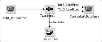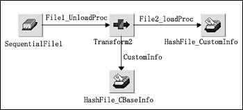 由于不同的源數(shù)據(jù)中可能包含同一個客戶的信息,因此采用Hashed File Stage HF_khjbxx存放輸出結果,相同客戶的信息根據(jù)客戶編碼覆蓋前面產生的信息,避免了重復的客戶信息。從不同源數(shù)據(jù)庫取得客戶信息,根據(jù)數(shù)據(jù)的真實性依次進行處理后,生成的客戶信息全部保存在一個Hash文件中,最后從Hash文件中取出結果數(shù)據(jù)裝載到目標數(shù)據(jù)庫中。