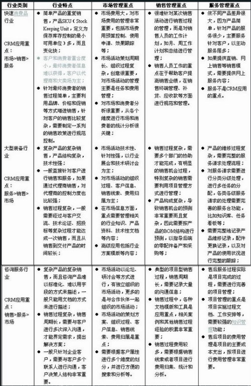 我們知道CRM管理的主要是市場(chǎng)、銷售和服務(wù)的相關(guān)業(yè)務(wù),而在這三個(gè)業(yè)務(wù)領(lǐng)域中,不同行業(yè)的業(yè)務(wù)特點(diǎn)和管理要求差別很大。就CRM來說,我們可以從產(chǎn)品和客戶的復(fù)雜性,市場(chǎng)、銷售和服務(wù)過程的復(fù)雜性等方面來進(jìn)行行業(yè)特點(diǎn)的分析。在這里,我主要選取了以快速消費(fèi)品、大型裝備和咨詢服務(wù)三個(gè)行業(yè)為例,就其行業(yè)特點(diǎn)和市場(chǎng)、銷售和服務(wù)管理重點(diǎn)進(jìn)行簡(jiǎn)單的分析。
