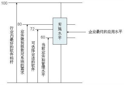 如果用一個(gè)數(shù)量化的概念來表達(dá)的話,假定行業(yè)內(nèi)最好的軟件是100分,企業(yè)做到極致對(duì)系統(tǒng)的需求可能是80分,當(dāng)然也可能沒有一個(gè)軟件能滿足企業(yè)所有的需求,但從整體上,一個(gè)企業(yè)的主體需求一定在行業(yè)內(nèi)最好的軟件標(biāo)桿之下。而當(dāng)前的業(yè)務(wù)和管理水平一般到不了極致,假設(shè)是60分,那選擇的軟件70-75分一定是合適的,高于當(dāng)前需求,而不要高得太多,最終的實(shí)施水平是一個(gè)區(qū)間,這取決于實(shí)施商的能力和企業(yè)的能力,可能會(huì)低于企業(yè)當(dāng)前業(yè)務(wù)和管理水平,也可能使系統(tǒng)超水平發(fā)揮,而企業(yè)最終的應(yīng)用水平一般就在這個(gè)區(qū)間里游動(dòng)了。這個(gè)模型看起來很理論化,操作時(shí)需要考慮很多的因素,但是非常有價(jià)值的判斷標(biāo)準(zhǔn)。