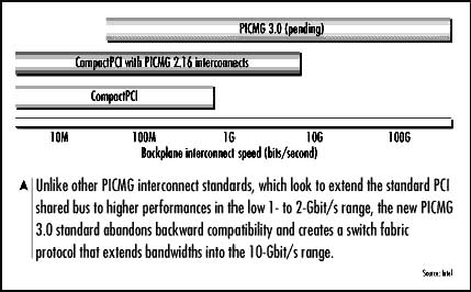 PICMG是CompactPCI的升級標(biāo)準(zhǔn),但是與CompactPCI有很大的不同,CompactPCI是共享式總線結(jié)構(gòu),而PICMG提供了交換式連接,每個點到點的連接能達(dá)到10Gbps的帶寬。圖1所示為幾種技術(shù)的互聯(lián)帶寬比較。PICMG標(biāo)準(zhǔn)的提出主要是針對電信行業(yè)方面的應(yīng)用,因此在供電方面采用了電信界的雙-48V電源標(biāo)準(zhǔn),而非CompactPCI的ATX電源標(biāo)準(zhǔn)。因此,PICMG標(biāo)準(zhǔn)與CompactPCI在很大程度上不兼容。