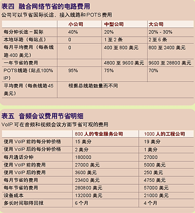 據(jù)研究顯示,當(dāng)公司融合它們的網(wǎng)絡(luò)后,將電信費用減少了25%到60%。(見表四)這筆費用包括每分鐘長途、本地環(huán)路、普通電話服務(wù)(POTS)線路和音頻/視頻服務(wù)。